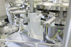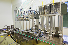 クラス1万の環境で充填されます。液体製品が充填される容器の代表格はプラスチック製ボトルです。内容量や使用方法、また液の粘性などによって様々な機能のキャップやポンプと組み合わせることになります。容器仕様や内容量、又生産数量等に応じた適正な充填ラインを選択しますので、幅広く安定した充填が行えます。近年は需要増に対応して特に詰替え用パウチ袋への充填能力を充実させております。